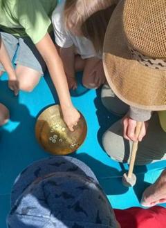 In der Klangecke konnten wir beobachten wie die Gänseblümchen in einer mit Wasser gefüllten Klangschale zum Tanzen gebracht werden. Und wir haben, als die Schale angespielt wurde, mit unseren Fingern gefühlt wie sich die Schwingung aufs Wasser überträgt.
