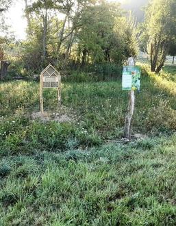 Das Insektenhotel steht auf der, im Rahmen des Projektes bereits geschaffenen, Blühwiese und bietet ab sofort Nistmöglichkeiten für Wildbienen und viele andere Insekten.