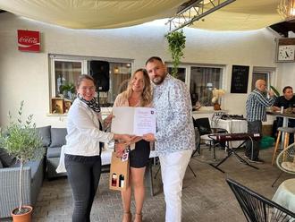 Bürgermeisterin Heckler übergibt das Geschenk und die Urkunde an Marianna Mantea und Konstantinos Mittas.