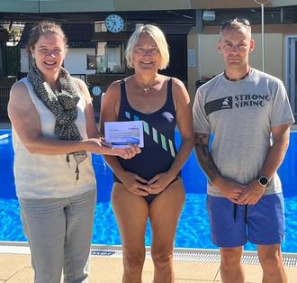 Bürgermeisterin Deirdre Heckler und Bademeister Jörg Köbler gratulierten Petra Sauter (Mitte) und überreichten den Gutschein für die Eintrittskarte 2024.