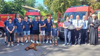 Die Mitglieder der Freiwilligen Feuerwehr Breuberg Neustadt mit Rai-Breitenbach sowie Bürgermeisterin Deirdre Heckler (5. v. links), Wehrführer Jan Vogelsanger, Stadtbrandinspektor Gert Hartmann, 1. Vorsitzende Michael Schwarz sowie Pfarrer Dieter Borck aus Schöllenbach.