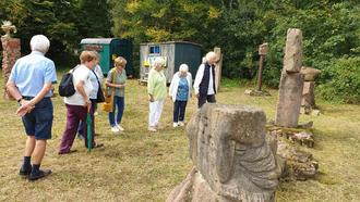 Deshalb machten wir uns nach erfolgter Stärkung auf den Weg und erkundeten Natur, Kultur und Kunst im Kurpark. Alte Bäume und Wiesen mit wilden Blumen säumen die Wege. Diese großen Wiesenflächen bieten Platz für die Skulpturen von vielen verschiedenen Künstlern. Marianne erläuterte uns einige ihrer eigenen Werke, die dort zum Innehalten und Besinnen ausgestellt sind. Das alles hat uns sehr fasziniert.