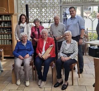 Sitzend v.l.n.r.: Marianne Knöll, Maria Steffen und Katharina Renner (alle Breuberg); stehend v.l.n.r.: Bürgermeisterin Deirdre Heckler (Breuberg), Apollonia (Loni) Löffler, Karl-Heinz Fertig und Bürgermeister Tassilo Schindler (alle Lützelbach).