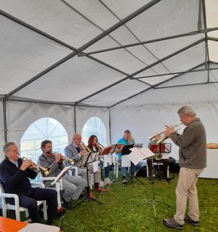 Nach dem Agape-Mahl mit Brotmumbel und Weintrauben intonierte der Breuberger Posaunenchor unter der Leitung von Prof. Hofmann noch das bekannte Segenslied „Komm, Herr, segne uns...“ und mit den Segenszuspruch von Uli Schadt durfte sich die Gemeinde an diesem herrlichen Sonntag auf all die Leckereien freuen, die von den fleißigen Helferinnen und Helfern des OGV mit viel Liebe zum Detail vorbereitet waren.