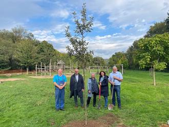 v.l.n.r.: Gert Hartmann (Andros), Geschäftsführer der Andros Deutschland Guy Tiebackx, die Erste Stadträtin Ute Kowarschik, Andrea Steinkamp (Andros) und Marcus Heil (Andros) bei der Baumpflanzung