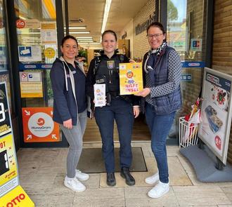 v.l.n.r.: Lyubomira Kodrova-Dencheva (Nah&Frisch Denchev, Marika Becker (Polizeikommissarin, Dienststelle Höchst) und Bürgermeisterin Deirdre Heckler bei der Plakatübergabe vor dem Supermarkt „Nah & Frisch Denchev“