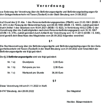 zur Änderung der Verordnung über die Beförderungsentgelte und Beförderungsbedingungen für den Gelegenheitsverkehr mit Taxen (Taxitarif) in der Stadt Breuberg vom 31.08.2022