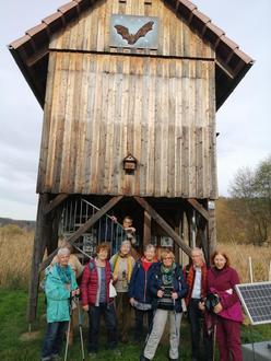 Nächster Halt wurde eingelegt am Feuchtbiotop des NABU Breuberg. Auch der Fledermausturm wurde erklommen, um das Ganze von oben zu besichtigen. Die „INSEL“, von den Anwohnern so genannt, wurde uns von Karin erklärt: Eingebettet in den Mühlgraben der Rosenbacher Mühle und der Mümling entstand hier eine Halbinsel. Streuobstwiesen werden hier gehegt und gepflegt. Der Weg führte weiter durch das Wiesental, vorbei am Hainstädter Sportplatz.