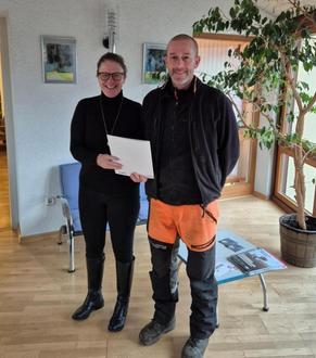 Bürgermeisterin Heckler gratuliert Tobias Hotz zur bestandenen Prüfung.