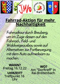 Die Fahrrad-Aktion findet am Freitag, den 16.12.2022 statt. Treffpunkt ist um 16 Uhr am Dorftreff in Rai-Breitenbach.