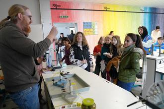 Physiklehrer Oliver Karg (links) lässt vor den staunenden Besuchern eine Gurke in hellem Licht erstrahlen.