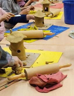 Zuerst wurde der Ton gründlich geklopft, ausgerollt und in Form gebracht. Danach wurden mit viel Geduld und Geschick die Kanten und Nahtstellen sorgfältig verschlickert. Anschließend erhielt jedes Häuschen sein passendes Dach. Mit großer Sorgfalt wurden kleine Fenster und Türen ausgeschnitten und die Häuschen liebevoll verziert. So wurde jedes Ton-Häuschen zu einem ganz persönlichen Kunstwerk.