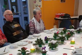 Die Kaffeetafel war der Adventszeit entsprechend mit Tannengrün und Kerzen geschmückt. Zahlreiche Mini- Blumentöpfe mit Veilchen oder auch anderen Pflänzchen ergänzten das festliche Bild. Ursel begrüßte erfreut die „zahlreich erschienen Teilnehmer“ und eröffnete das letzte Seniorentreffen in diesem Jahr nicht ohne den Hinweis, dass die Deko nicht nur zum Anschauen, sondern auch zum Mitnehmen ist - als kleine Bescherung.