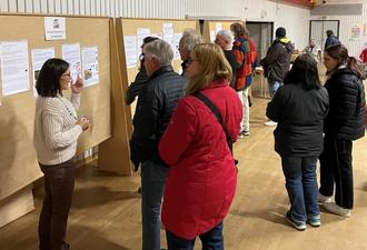 v.l.n.r.: Dr. Karin Lichtblau (Vorsitzende des Ausschuss für Umwelt und Landwirtschaft und Initiatorin des Ideenwettbewerbs) (li.) im Gespräch mit dem Stadtverordnetenvorsteher Theo Böhm und Besucherinnen und Besucher vor der Ideenwand.