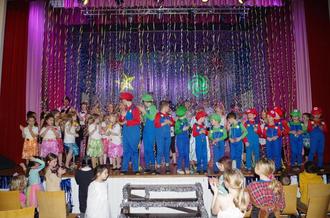Weiter ging es akrobatisch mit den Starken Kerlchen verkleidet als Super Marios und Luigis. Mit Trampolin, Kasten und Matte boten Sie eine atemberaubende Show. Es turnten Mikael Akar, Esdullah Aluz, Abdulhalim Aluz, Ilyas Can, Jonathan Fischer, Nevio Giegerich, Moritz Heusel, Stanislaw Kaluza, Tobias Mehnert, Vincent Schreck, Aiden Stawinoga und Leander Trumpfheller, trainiert von Louis Ehrhard und Hardy Köbler.