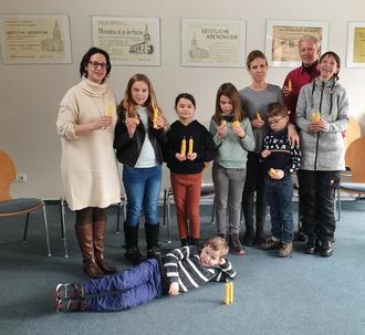 Dies war gar nicht so einfach… Passend zum Thema wurden im Anschluss Kerzen aus Bienenwachs gewickelt, die von Herrn Pfarrer Schachner zusätzlich geweiht wurden.