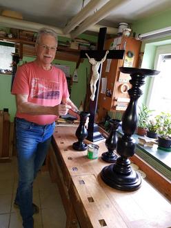 Kerzen und Kerzenständer für die Breuberger Kirchen In Zukunft soll es in allen unseren Breuberger Kirchen eine schöne große Osterkerze geben. Dafür hat sich für Hainstadt ein passender Kerzenständer zu den Altarkerzenständern gefunden und für Rai-Breitenbach haben wir ebenfalls neue Kerzenständer für die Osterkerze und den Altar besorgt. Erich Stütz hat sie in der passenden Farbe zum Kreuz gestrichen und nun warten sie auf ihren Einsatz. Vielen Dank dafür! An Ostern werden die neuen Kerzenständer in den Kirchen erstmals aufgestellt werden und wir werden das Osterlicht in die Kirchen tragen. Dieses Jahr wird es in Rai-Breitenbach besonders feierlich, da wir dort die Osternacht feiern und schon morgens früh um 6.00 Uhr das Osterlicht in die dunkle Kirche tragen werden. Diesen besonderen Gottesdienst sollten Sie sich nicht entgehen lassen.