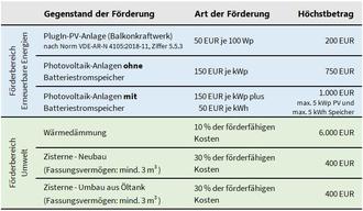Im wichtigen Bereich Erneuerbare Energien werden vor allem PV-Anlagen mit und ohne Batteriestromspeicher mit bis zu 1.000 Euro gefördert. Ein Fokus wird hier auf die nachhaltige Erzeugung von Energie gelegt. Ebenso werden nach wie vor die sogenannten Balkonkraftwerke (PlugIn-PV-Anlagen) mit bis zu 200 Euro unterstützt. Es stehen weiterhin ausreichend Fördermittel zur Verfügung.