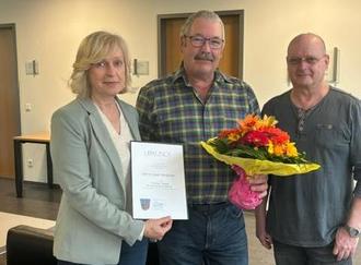 Die Erste Bürgermeisterin, Astrid Kaiser überreichte ihm eine Urkunde sowie einen Blumenstrauß als Dank für seinen langjährigen Einsatz und seine zuverlässige Arbeit.