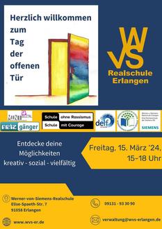Die Werner-von-Siemens Realschule Erlangen lädt alle am Übertritt interessierten Schüler und Schülerinnen sowie deren Erziehungsberechtigte herzlich zum Tag der offenen Tür am 15. März 2024 (15.00-18.00 Uhr) ein.