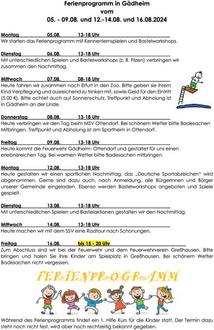 Anmeldung zum Ferienprogramm ist noch bis 26.07.2024 möglich. Das Anmeldeformular findet Ihr auf der Homepage.