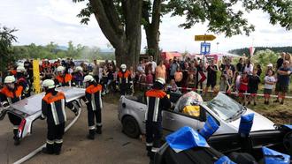 Mit einer Schauübung demonstrierte die Feuerwehr Greßhausen zusammen mit einigen umliegenden Wehren das Vorgehen bei einem Autounfall mit eingeklemmter Person.