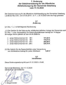 7. Änderung der Gebührensatzung für die öffentliche Abfallentsorgung der Gemeinde Osterberg vom 11.12.2024