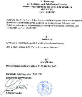 zur Wasserabgabesatzung der Gemeinde Osterberg (BGS-WAS) vom 16.05.2023