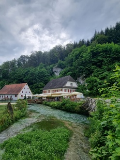 Nach so viel Kultur war es höchste Zeit für einen Kaffee und wir fuhren zu unserem eigentlichen Ziel, der Wimsener Höhle. Leider war auch diese vom Hochwassergeschehen betroffen, sodass wir keine Bootsfahrt in die Höhle machen konnten. Es blieb uns nur, die Natur und die wunderschöne Gegend ein wenig zu bestaunen und uns im Gasthof Friedrichshöhle, direkt am Bach gelegen, ein wenig zu stärken.