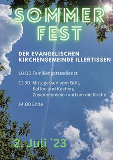 Die Evangelische Kirchengemeinde feiert am 2. Juli 2023 ein Sommerfest.Begonnen wird der Tag um 10:00 Uhr mit einem Familiengottesdienst in der Christuskirche. Ab 11:30 Uhr bis 14:00 Uhr