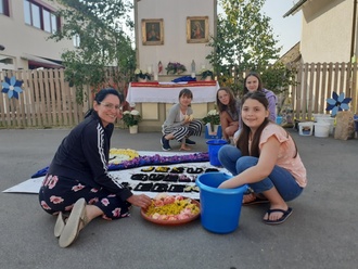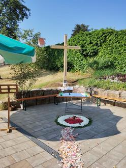 Den vierten Altar mit Blütenteppich am Kindergarten haben viele Minis mit Regina und Gegge übernommen. Schon am Vorabend wurden im ganzen Ort mit Wannen Blüten gesammelt und Schablonen vorgefertigt. Erst nachts um 10 Uhr kehrte Ruhe ein im Feuerwehrhaus, morgens um halb 7 Uhr konnten die duftenden Blüten dick aufgelegt werden. „Jesus Quelle des Lebens“