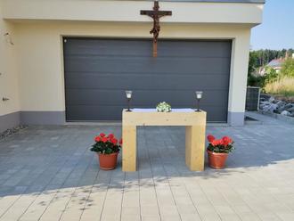 Eine neue, moderne Version -, ein schlichter Holzaltar. Er stammt aus der Zimmerei Möst aus Altenstadt, Familie Bauer hat ihn gegen eine Spende erstanden. Nach dem Gottesdienst an ungewöhnlichen Orten war Georg Bauer Feuer und Flamme und hat ihn sofort für sich organisiert.