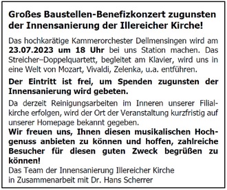 Die Jahresrechnung 2021 der Kath. Kirchenstiftung „St. Martin“ Herrenstetten kann vom 14.07.2023 bis 03.08.2023 während der Öffnungszeiten im Kath. Pfarramt Altenstadt, Bahnhofstraße 14, 89281 Altenstadt nach vorheriger Terminvereinbarung eingesehen werden.