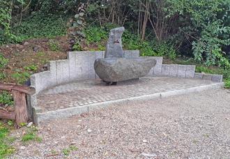 Mit den halbkreisförmig angeordneten Granitstelen auf der Rückseite ist die Hangsituation eingefasst worden; das Natursteinpflaster und der Wasseranschluss wurden anschließend komplett erneuert bzw. der neuen Situation angepasst.
