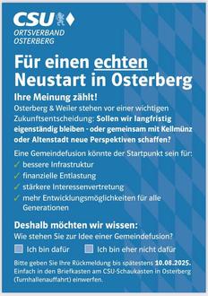 der CSU-Ortsverband möchte gerne Ihre Meinung zum Thema Eingemeindung unseres Dorfes erfahren. Deshalb führen wir eine freiwillige und anonyme Umfrage durch, um ein aktuelles Stimmungsbild in unserer Gemeinschaft zu erhalten.