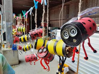Zuerst wurden mitgebrachte Blechdosen zweimal grundiert, anschließend bekamen sie die Streifen bzw. Punkte mit Hilfe von Isolierband bzw. Farbe. Für die Augen wurden bemalte Kronkorken verwendet, und Pfeifenputzer wurden zu Beinchen umfunktioniert. Danach wurden die Dosen noch mit Flügeln (hierzu dienten alte Plastikflaschen) und mit Aufhänger versehen. Und ganz zum Schluss wurden die Dosen mit dickeren Brennessel- sowie Strohhalmen gefüllt.