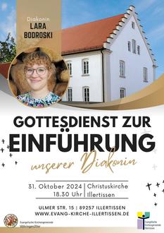 | 18.30 Uhr: | Gottesdienst mit Einführung von Diakonin Lara Bodroski, Christuskirche, Illertissen (Pfarrer Daniel Städtler) |