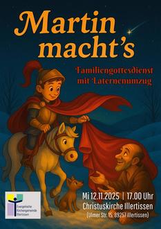 | 17.00 Uhr: | Martin macht’s – Familiengottesdienst mit Laternenumzug, Christuskirche, Illertissen (Pfarrer Daniel Städtler) |