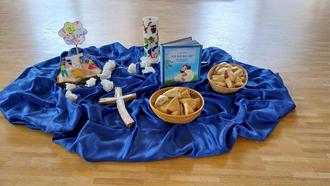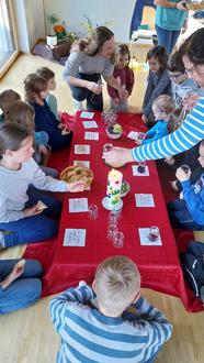 Dies gilt auch für Dinge, die einem vielleicht nicht so gefallen. Danach haben wir den Kindern gezeigt, wie Jesus mit seinen Jüngern das Brot brach und das Abendmahl eingenommen hat. Jeder durfte ein Stück Fladenbrot und einen Traubensaft trinken, um dieses gemeinsame Essen nachzuempfinden. Danach ging es zur nächsten Station, den Garten Getsemane. Hier hörten wir ebenfalls Texte aus der Kinderbibel und sangen gemeinsam „Bleibet hier und wachet mit mir – wachet und betet“. Denn genau dies sagte Jesus zu seinen Jüngern. „Bleibt hier und wacht mit mir“ und er sagte weiter: „Wacht und betet, damit ihr nicht in Versuchung kommt“. Mit diesem Lied und den Gedanken an den bevorstehenden ruhigen Karfreitag und dem Hinweis, dass man am Karfreitag und Karsamstag Ministranten mit den Rätschen laufen sieht, haben wir den Abend beendet.