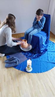 Das Himmelsstürmer-Team hat am Gründonnerstag zu einem gemeinsamen Gottesdienst ins Paulushaus eingeladen. Wir erinnerten uns an das letzte Abendmahl von Jesus. Begonnen haben wir mit einer Fußwaschung, mit der wir den Kindern erklärten, dass Jesus seinen Jüngern die Füße wusch und ihnen so zeigte, dass man einander dienen soll. Anderen helfen und beistehen.
