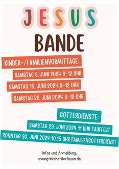 | 19.00 Uhr: | Info-Abend zur Jesus-Bande, Evang. Gemeindehaus Vöhringen |