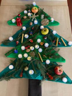 Im Mittelpunkt stand ein Tannenbaum, der Schritt für Schritt gemeinsam geschmückt wurde. Die Kinder erfuhren dabei, dass der Tannenbaum mit seinen immergrünen Zweigen ein Zeichen der Hoffnung ist – denn „Grün ist die Hoffnung“. Passend dazu legten die Kinder grüne Zweige auf das Tuch.