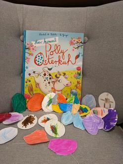 Am Vorlesenachmittag, Mittwoch, dem 13.03.2024, drehte sich alles um Ostern. Margot Neubauer las den Kindern die Geschichte „Hier kommt Polly Osterkuh“ vor.