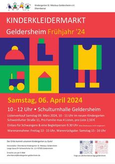 Kinderkleidermarkt am Samstag, 6. April 10.00 bis 12.00 Uhr in der Schulturnhalle. Einlass für Schwangere 9.30 Uhr (Bitte den Mutterpass mitbringen).