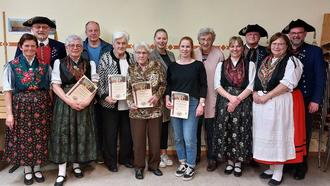 Im Rahmen unserer Jahreshauptversammlung wurden zahlreiche Mitglieder für 25 Jahre Mitgliedschaft im Verein geehrt. Vor 25 Jahren feierten wir unser 10-jähriges Bestehen mit einem großen Trachtenfest. Daher hatten wir damals auch zahlreiche Neuaufnahmen. So konnten von der 1. Vors. Renate Moreth, Andreas Hübner, Luzia Hübner, Lioba Brust, Julia Hammer, Anna Lauerbach, Heide Hemrich und Ida Bartenstein ausgzeichnet werden. Von der ufr. Gauvorsitzenden Inge Burkhard-Vatterodt erhielt Ida Bartenstein das silberne Ehrenzeichen für 25 Jahre Tracht-Tragen. Ida war außerdem von 2014 bis 2021 Gauschriftführerin und hat dieses Amt derzeit wieder kommissarisch inne. Die Gauvorsitzende dankte ihr auch für Ihren bisherigen Einsatz für den Trachtenverband.