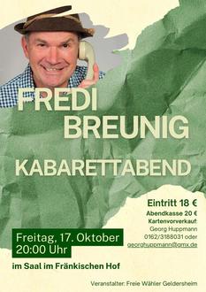 Wenn man Fredi Breunig fragt, wie er zu seinen Programmen und Gags kommt, bekommt man oft die Antwort: „Einfach aufmerksam durchs Leben gehen, Augen und Ohren auf und beobachten. Das Leben schreibt die wahren Geschichten.“ Ja, das ist die große Spezialität und Leidenschaft von Fredi Breunig, Kabarettist aus Salz bei Bad Neustadt/Saale im Landkreis Rhön-Grabfeld. Nachdem der im Jahr 2013 mit dem Frankenwürfel und 2023 mit dem Bayerischen Verdienstorden und dem Dialektpreis Bayern ausgezeichnete, kabarettistische Tausendsassa seit bereits 40 Jahren zusammen mit seinem Kollegen Martin Wachenbrönner auf fränkischen Faschingsbühnen unterwegs ist („Gotthold & Eustach“) und auch immer wieder im Fernsehen zu sehen ist (z.B. bei „Fastnacht in Franken“ oder in der "Närrischen Weinprobe"), spielt er seit vielen Jahren auch kabarettistische Soloprogramme. Fredi Breunig kennt Land und Leute. Er liest viel Zeitung, hört Radio, surft im Netz und so ergibt sich jede Menge kabarettistischer Stoff. Vieles ist schlichtweg einfach unglaublich, was Fredi Breunig oft zum fränkischen Ausruf „Wallich nedd?!“ verleitet. Das ist dann auch der Name seines aktuellen Programms. Alles was er, sieht, hört und vernimmt, wird von Fredi Breunig höhnisch kolportiert, stets mit dem Charme des Einfältigen, der das Einfache, Verständliche in den Ereignissen sucht. Immer wieder gelingt es ihm, Neues auf die Bühne zu bringen. Dazu schaut er sich aber in erster Linie in seinem Umfeld um, wo im Grunde nichts Spektakuläres passiert. Aber gerade in dem Unspektakulären findet er die komischen Saiten – und dafür liebt ihn sein Publikum.