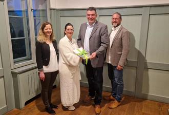 Leonie Kuhn, Christiane Wichmann (1. u. 2. v. links) und Architekt Joachim Perleth (rechts) übergeben das Integrierte Städtebauliche Entwicklungskonzept an Geldersheims Bürgermeister Thomas Hemmerich.