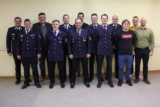 Von links: KBR Alexander Bönig, KBM Ralf Weber, Bürgermeister Thomas Hemmerich, Stv. Kommandant Karsten Weber, Kommandant Thomas Starek, Vorsitzender Mario Rath, künftiger Stv. Kommandant Hannes Warmuth, 2. Vorsitzender Marius Hammer, Kassenwart Daniel Huppmann, Schriftführer Johannes Krückel, Kassenprüfer Mario Ehwald, Kassenprüfer Steffen Brehm, künftiger Kassenwart Sebastian Barthelmes
