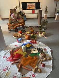Mit dem Lied „Einfach spitze, dass du da bist!“ starteten alle gut gelaunt in den Gottesdienst. Nach dem Anzünden der Kerze und einer kurzen Rückschau auf die Woche drehte sich alles um das Thema Dankbarkeit. Gemeinsam legten die Kinder Brot, Wasser, Äpfel, Rüben, Kartoffeln und Kürbis in die Mitte und dankten Gott für all die guten Gaben, die er uns schenkt.