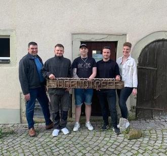 Im Bild von links: Erster Bürgermeister Hemmerich, Lars Baumeister, Louis Heymanns, Philipp Popp, Jugendbeauftragte Lena Kundmüller